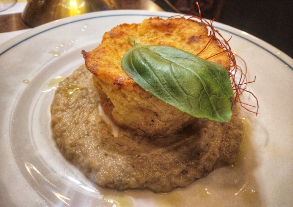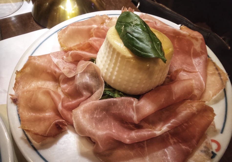 E così, accompagnati da una fragrante focaccina calda, sono arrivati in tavola la bruschetta con burro, alici e crema di broccoli, il tortino di patate e crema di melanzane con fili di peperoncino, i finger di polenta croccante con crema di broccoli e radicchio, la burratina affumicata con prosciutto crudo di Parma.